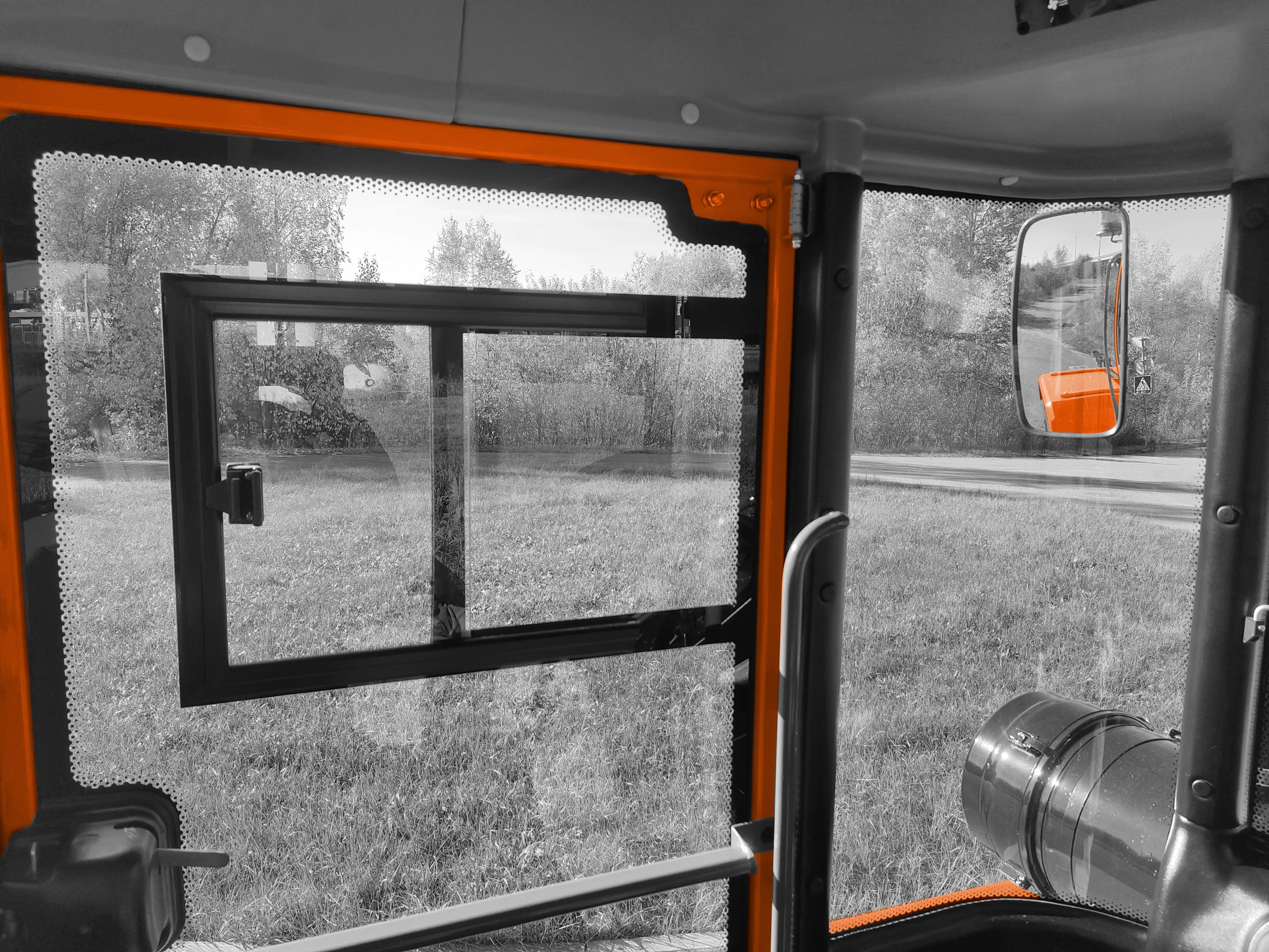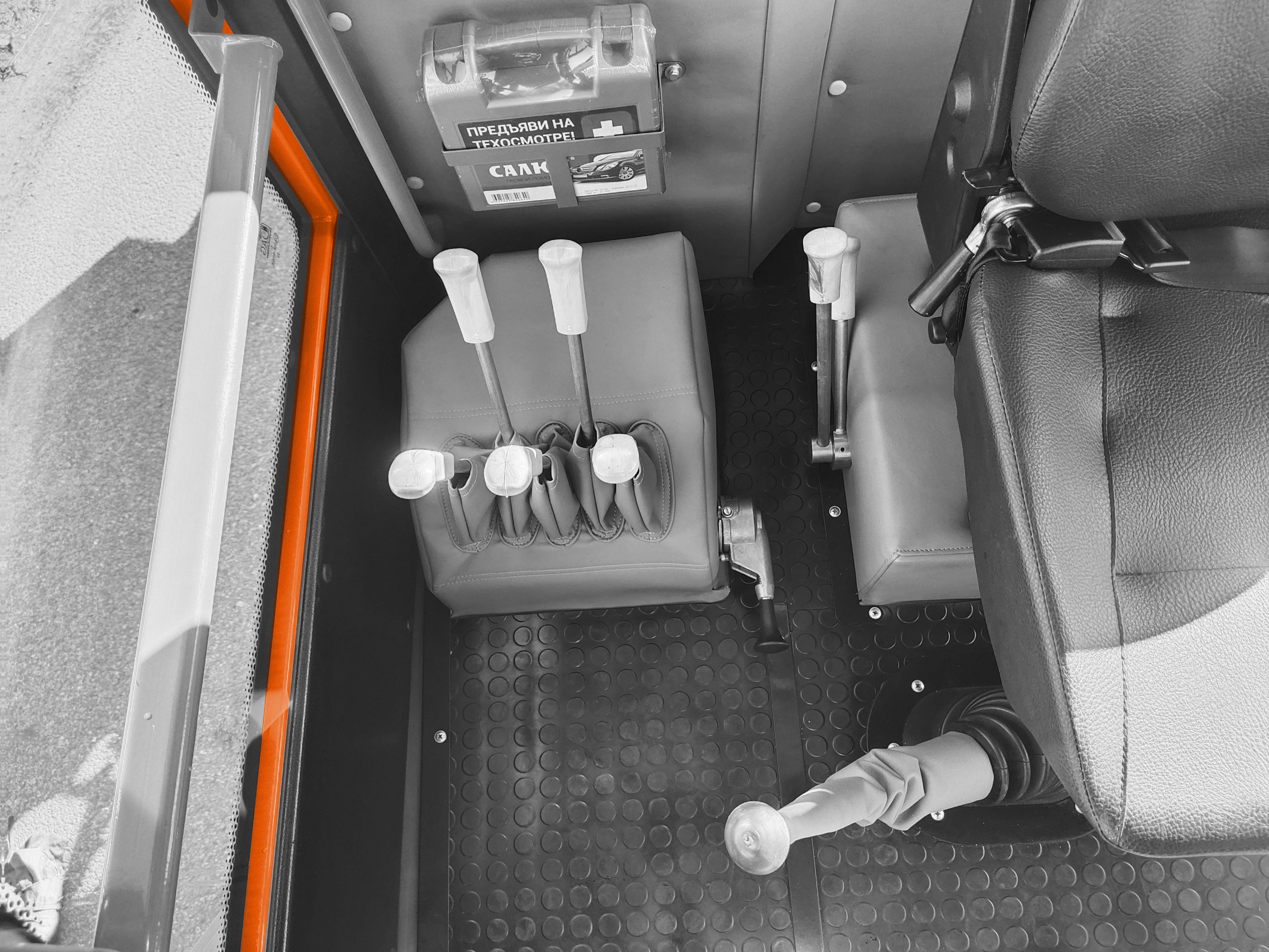 Кабина Панорамное остекление, интегрированный каркас безопасности, музыкальная подготовка, система обогрева и кондиционирования, дополнительное пассажирское место, две двери.